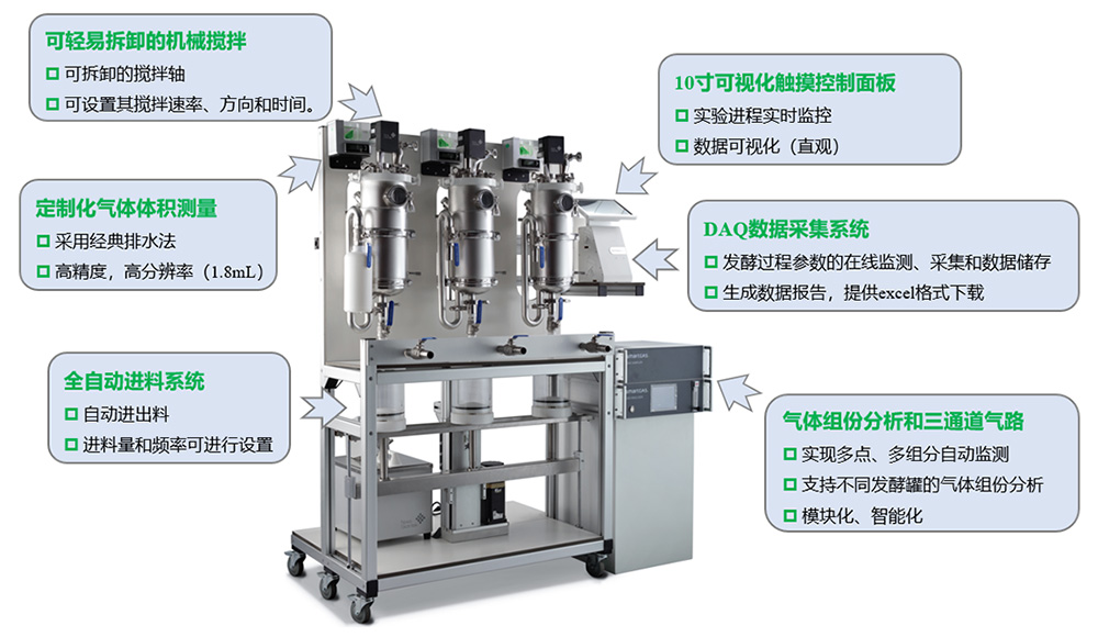 高通量多通道反应器组,与传统搅拌釜反应器相比,能在较小规模实现自动化程度较高的模拟,实现实验室到规模化生产之间的无缝对接,集成各类工艺参数的监测和数据分析,以帮助研究人员提升对工艺的理解,以及协助大中型沼气项目及工业化生物燃气生产企业优化生产工艺,并降低运行成本。